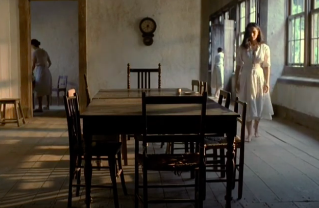Esse tipo de câmera não apenas particulariza e envolve a personagem principal, desnudando as suas percepções em diversas nuances, mas também confere poesia à cena. Ademais, ela funciona como um contraponto direto à ordem e à claridade da casa, representadas por um outro tipo enquadramento, flagrante nos momentos em que o discurso ordeiro, apolíneo, prepondera, como se verifica na foto a seguir: