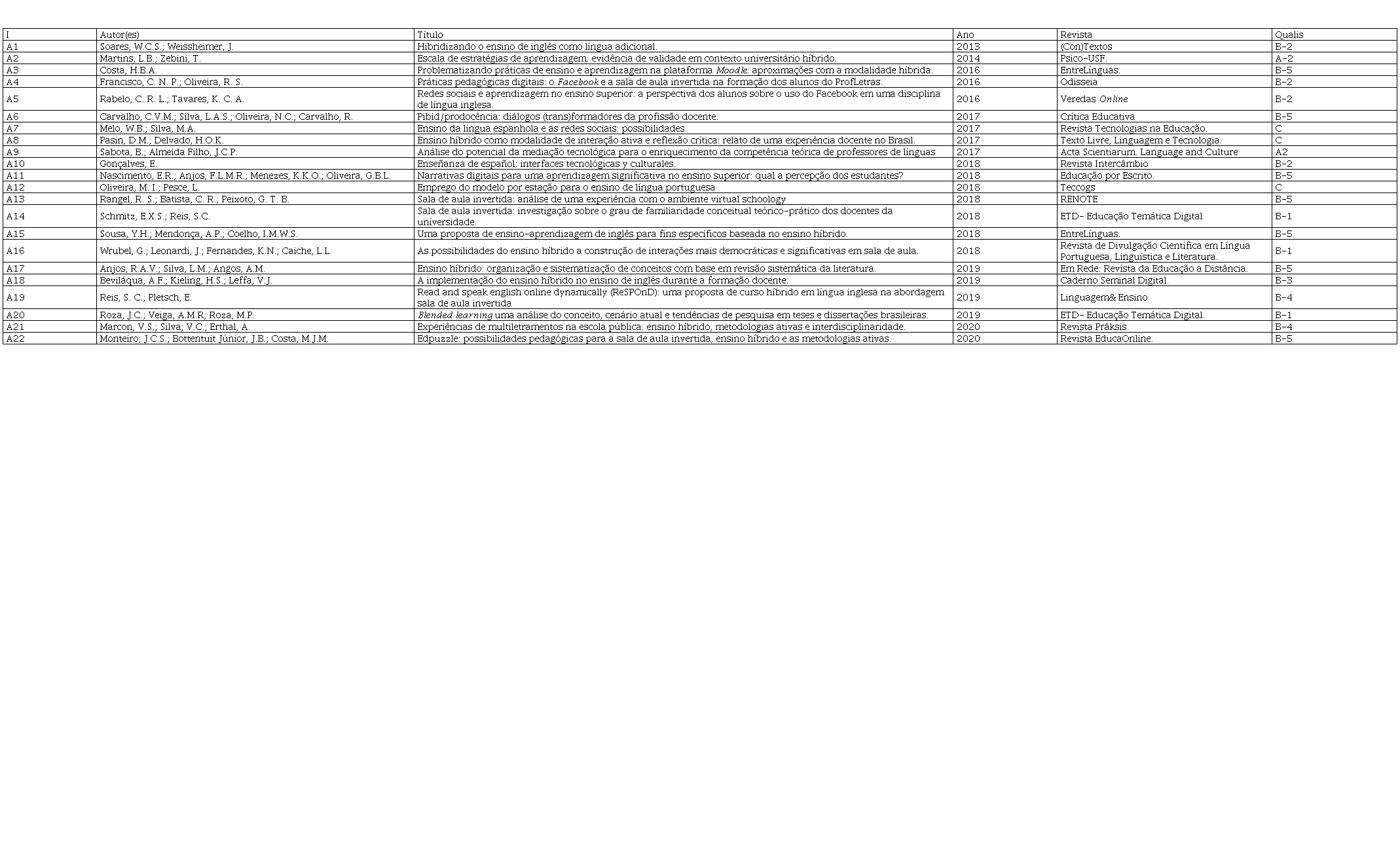 Como resultado dessa busca, para leitura prévia foram localizados trinta e oito (38) artigos que incluíam os descritores propostos, porém somente vinte e dois (22) atendiam ao requisito qualificação (Qualis-Periódicos da Capes). O mapeamento dos artigos selecionados foi organizado por ordem crescente segundo a data da publicação (Quadro 1) e identificados (.) pela letra . [significando artigo], seguida pelo número cardinal indicado sequencialmente.