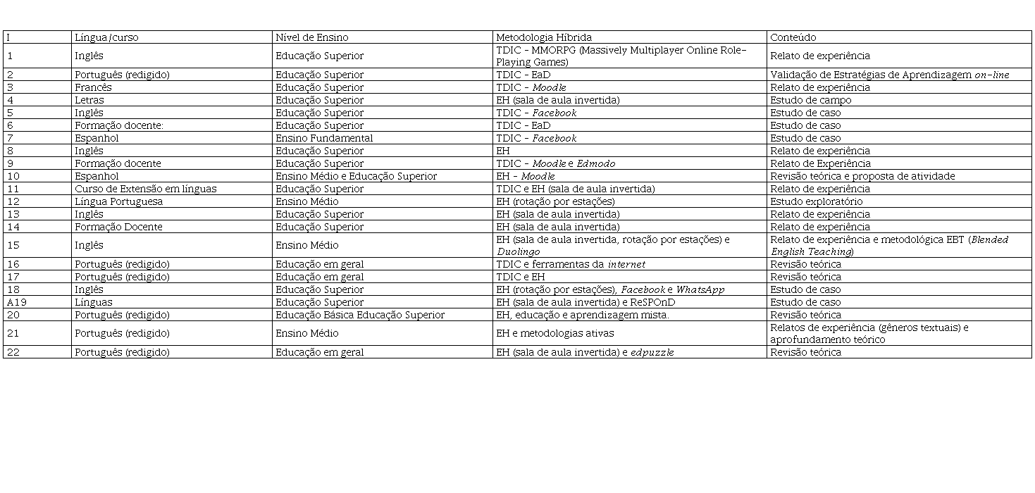 À medida que se discute e se constata, na prática docente, que a inserção tecnológica abre espaços para ampla interatividade e trocas de informações, o que tende a facilitar a compreensão de conteúdos curriculares e favorecer a aquisição de conhecimento de maneira ativa, participativa e colaborativa, acentuam-se os relatos na literatura brasileira sobre experiências de aplicação das TDIC nos processos de ensino e aprendizagem. Nessa perspectiva, diante do prolongado e histórico período da pandemia e do ensino remoto emergencial decorrente dela, pressupõe-se que, forçosamente, o ensino/aprendizagem híbrido adentra na escola, em todos os níveis da educação formal. A partir desse pressuposto, o objetivo desse artigo é analisar experiências de adoção de metodologias do ensino híbrido na Educação Básica e Educação Superior, relacionadas ao ensino presencial de português, inglês e espanhol no Brasil.