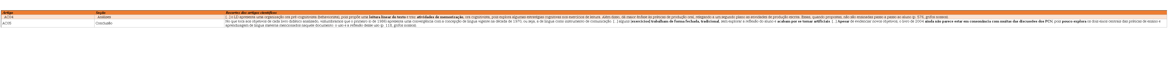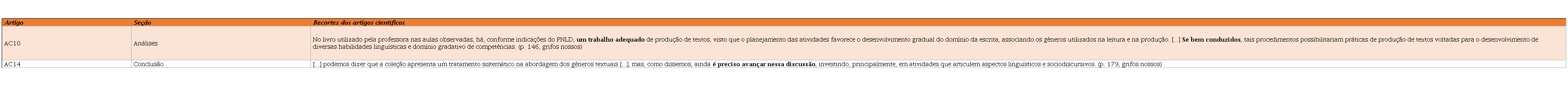 Entendendo que cada seção de um artigo científico cumpre finalidades retóricas bastante específicas (BESSA, 2016), traremos, para análise, recortes de discursos dos pesquisadores quando contextualizam e justificam suas investigações e/ou quando desenvolvem as interpretações e conclusões de seus trabalhos sobre o livro didático de português. Isso não significa deixar de olhar para as demais seções dos artigos selecionados, por entendermos que elas também aportam posições dos pesquisadores, o que implicou considerá-los, quando se julgou necessário. De todo modo, considerar, sobretudo, a seção de conclusão foi fundamental para a construção de categorias de análise como Aprovação/Reprovação do livro didático, Avanços/Agravamento/Estagnação no ensino de português, já que na referida seção os pesquisadores costumam demarcar, mais explicitamente, suas impressões e posicionamentos em relação aos achados da pesquisa empreendida.