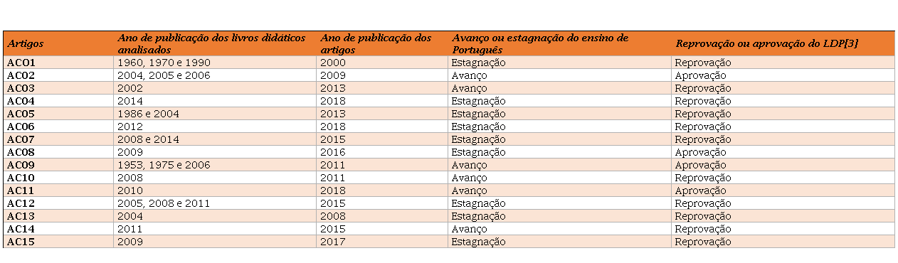As análises apontam, portanto, que os discursos dos pesquisadores se distribuem, de forma mais ou menos equilibrada, entre aqueles que reprovam aspectos do ensino de língua portuguesa e o uso do livro didático e aqueles que indicam transformações positivas sinalizadoras de avanços no ensino de língua portuguesa no Brasil. É possível perceber, contudo, que há uma ligeira predominância, nos artigos analisados, de discursos que manifestam elementos de reprovação em relação ao ensino de português e ao livro didático.