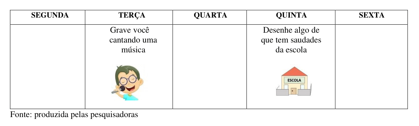 Primeiramente, foi realizado o envio de tirinhas por WhatsApp com solicitação de atividades para dois dias por semana. As tirinhas deveriam mediar a memória das crianças de modo a ajudá-las a se lembrarem de realizar as tarefas solicitadas para os dias específicos. Em cada tirinha foram indicadas, com imagens e com um pequeno texto escrito, atividades em dias intercalados. A cada semana eram enviadas novas tirinhas, com atividades diferentes e em dias diferentes. Um exemplo dessas tirinhas encontra-se na Figura 01.