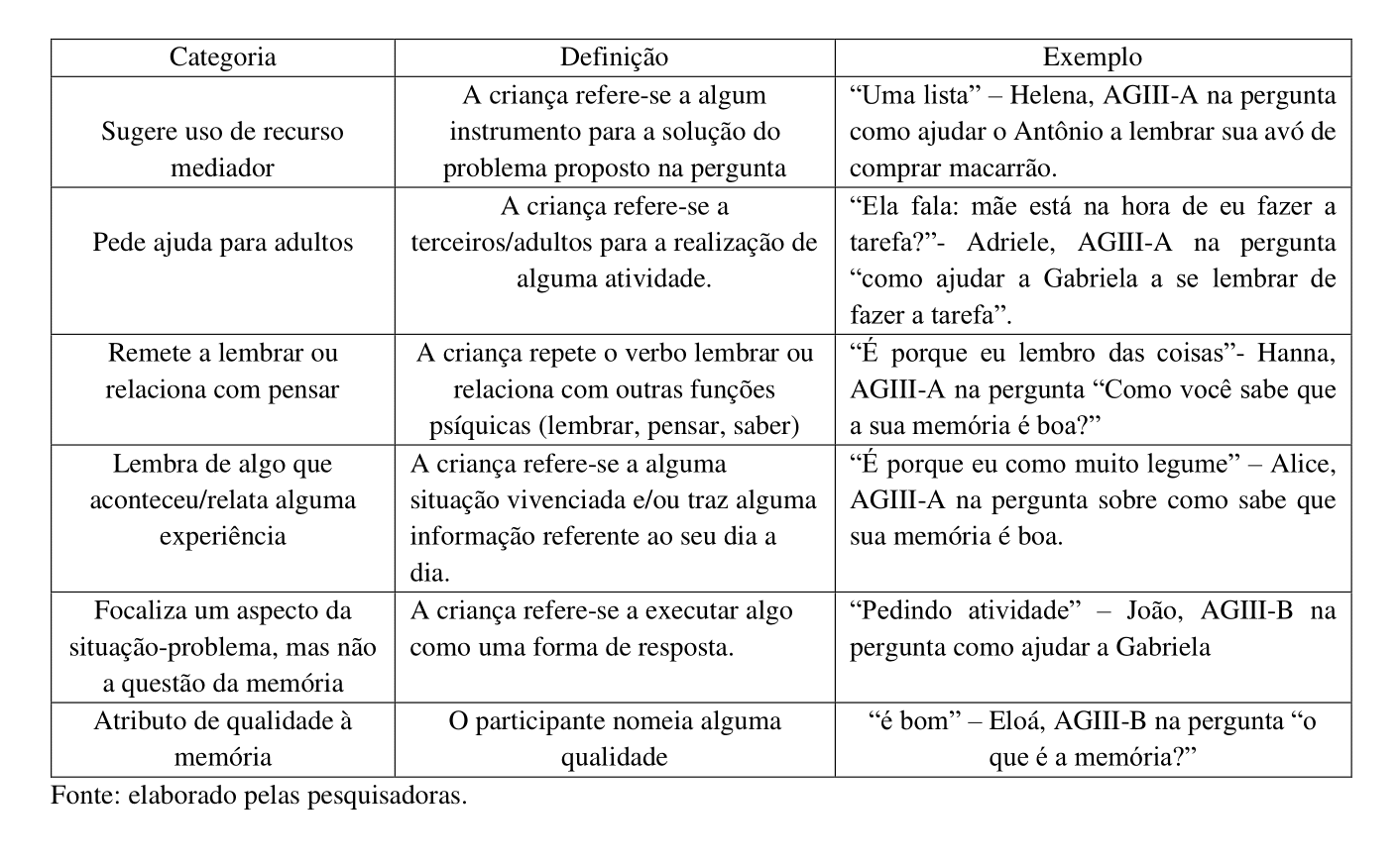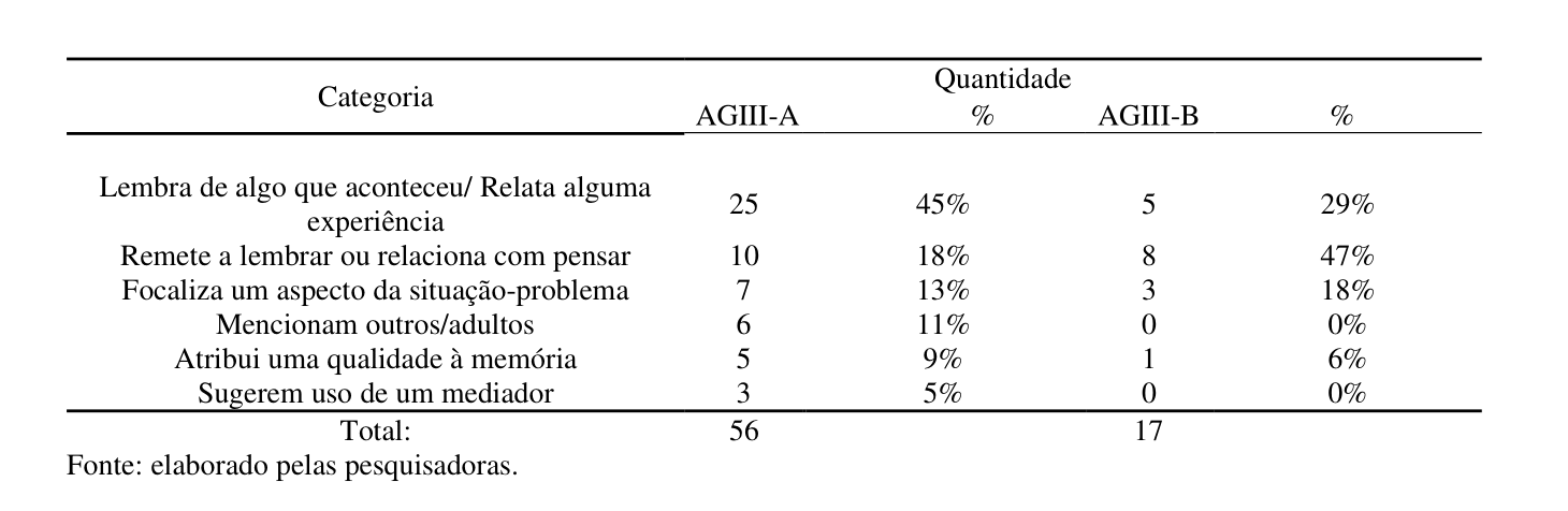Após a transcrição das entrevistas, as respostas foram lidas intensivamente e organizadas em seis categorias: “lembra de algo que aconteceu/relata alguma experiência”, “remete a lembrar ou relaciona com pensar”, “focaliza um aspecto da situação-problema, mas não a questão da memória”, “menciona outros/adultos”, “atribui uma qualidade à memória”, “sugerem uso de recurso mediador”. Essas foram as categorias que incluíram respostas que consideramos férteis para as análises. Importante mencionar que houve respostas que foram categorizadas como “respostas não finalizadas ou não compreensíveis”, “respostas simples como ‘sim” ou ‘não’”, “silêncio”; essas não foram incluídas no trabalho analítico. As definições e um exemplo para cada uma das categorias validadas para análises encontram-se no quadro 01.
