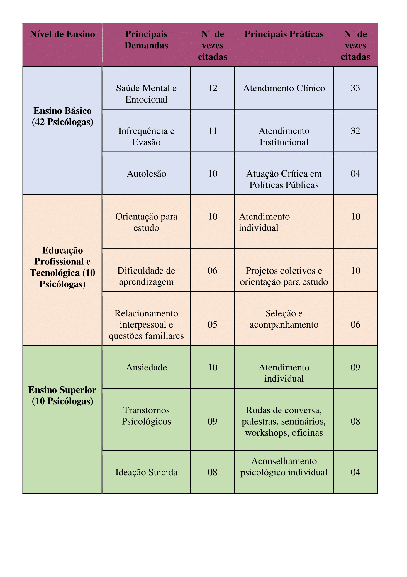 Como se observa, há uma variedade de demandas advindas de múltiplos contextos e que perpassam por diversas histórias de vida, família, questões socioeconômicas, emocionais, culturais e políticas. A demanda de saúde mental e emocional (12), que foi a mais citada, está diretamente relacionada a todas as outras demandas. Um olhar ampliado do conceito de saúde, é importante, tendo-o não apenas como a falta de doença ou transtorno; ver desta maneira, ajudará a distanciar-se de um atendimento clínico na escola - ainda feito por 33 das psicólogas (Tabela 01), ou seja, não agir pautada apenas em enquadramentos diagnósticos, pois estes podem gerar um processo de culpabilização (Arruda & Oliveira, 2018; Viegas, Freire & Bonfim, 2018).