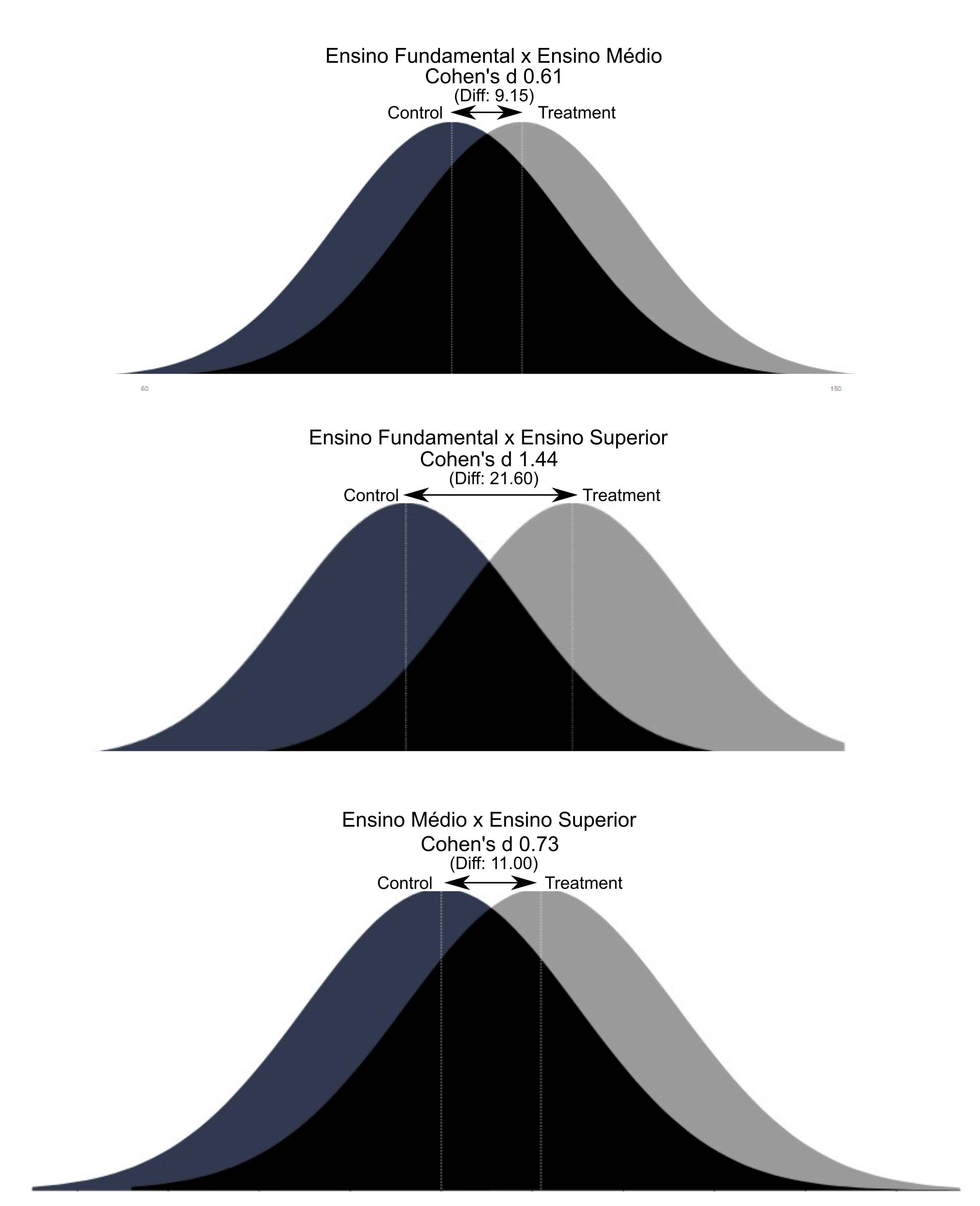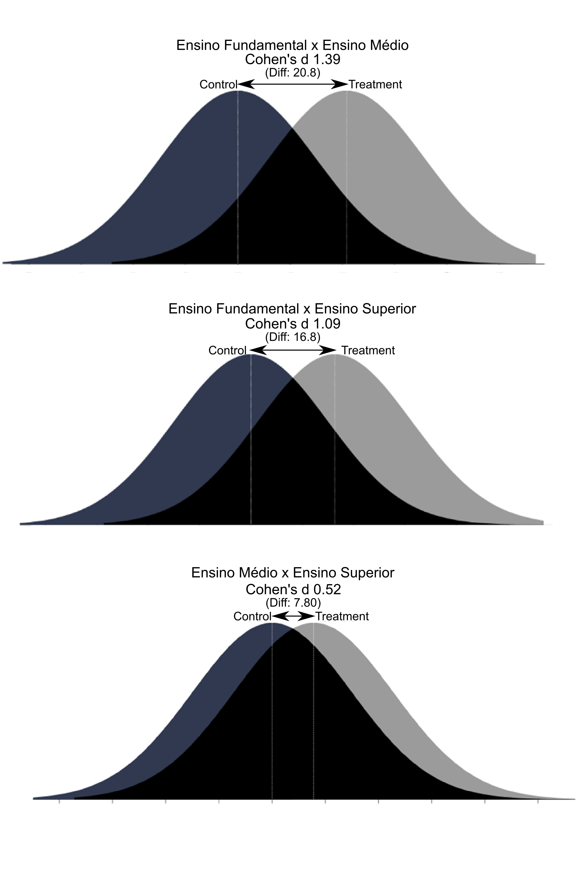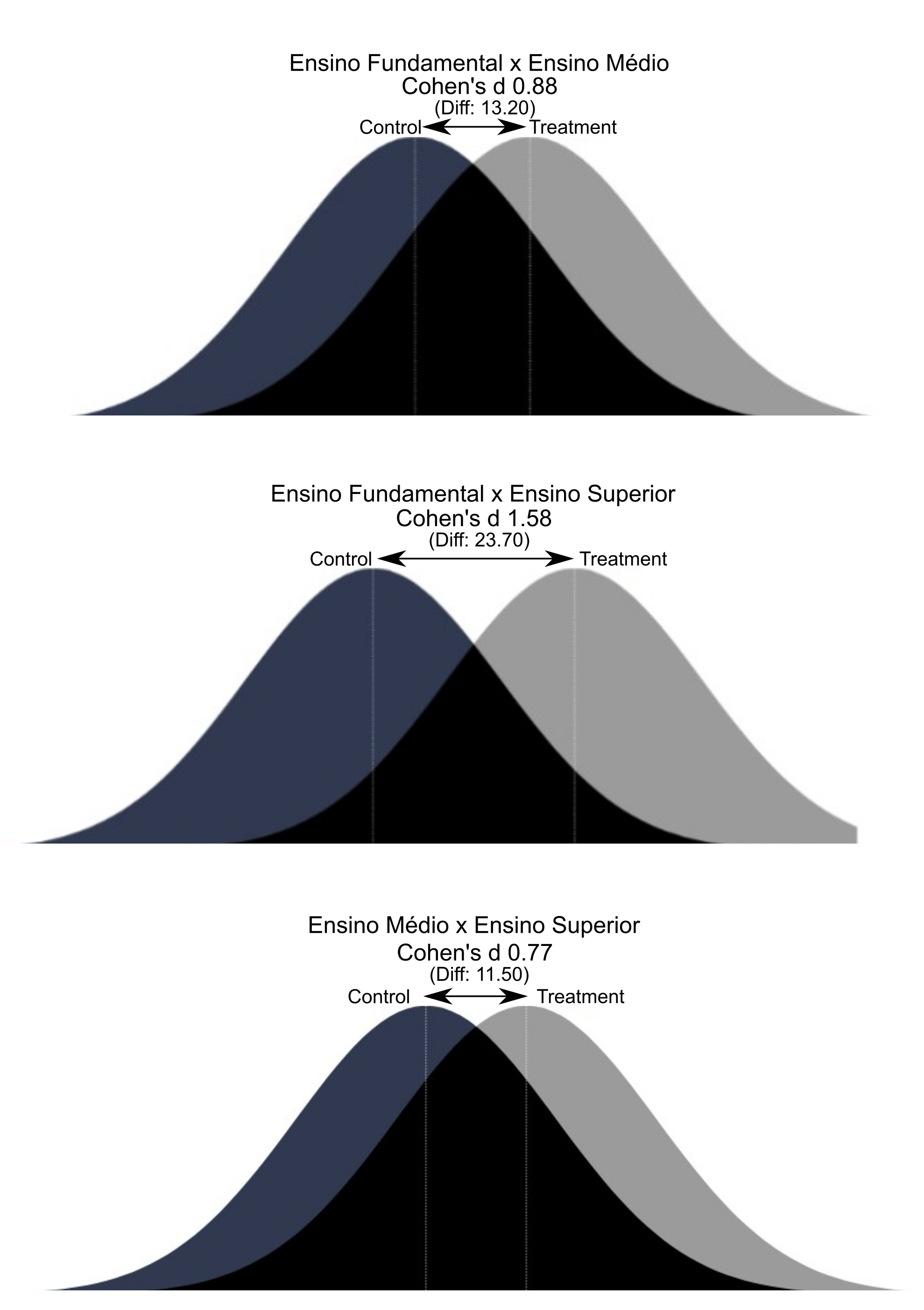 Quando se consideram as pontuações médias entre os níveis de ensino fundamental (. = 22.93, DP = 6.55) e superior (. = 31.86, DP = 4.32), o . apurado foi de 1,58, (IC 95% = 1.29, 1.87), considerado muito grande. Assim, 94.3% do grupo com nível superior estará acima da média do grupo com nível fundamental. Como consequência, a sobreposição será apenas de 43.0% entre os dois grupos, existindo 86.8% de chance de uma pessoa escolhida aleatoriamente no grupo com nível superior ter uma pontuação maior do que uma pessoa escolhida aleatoriamente no grupo com nível fundamental de ensino.