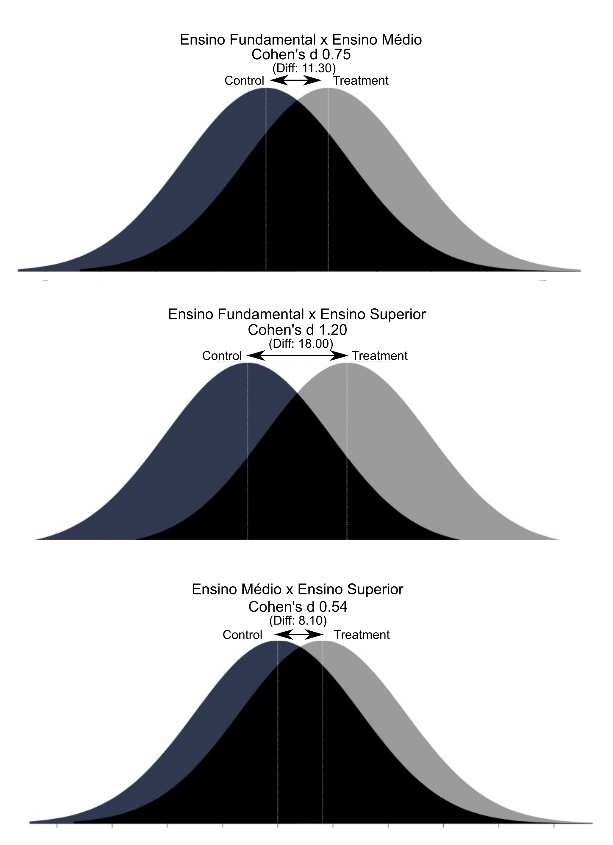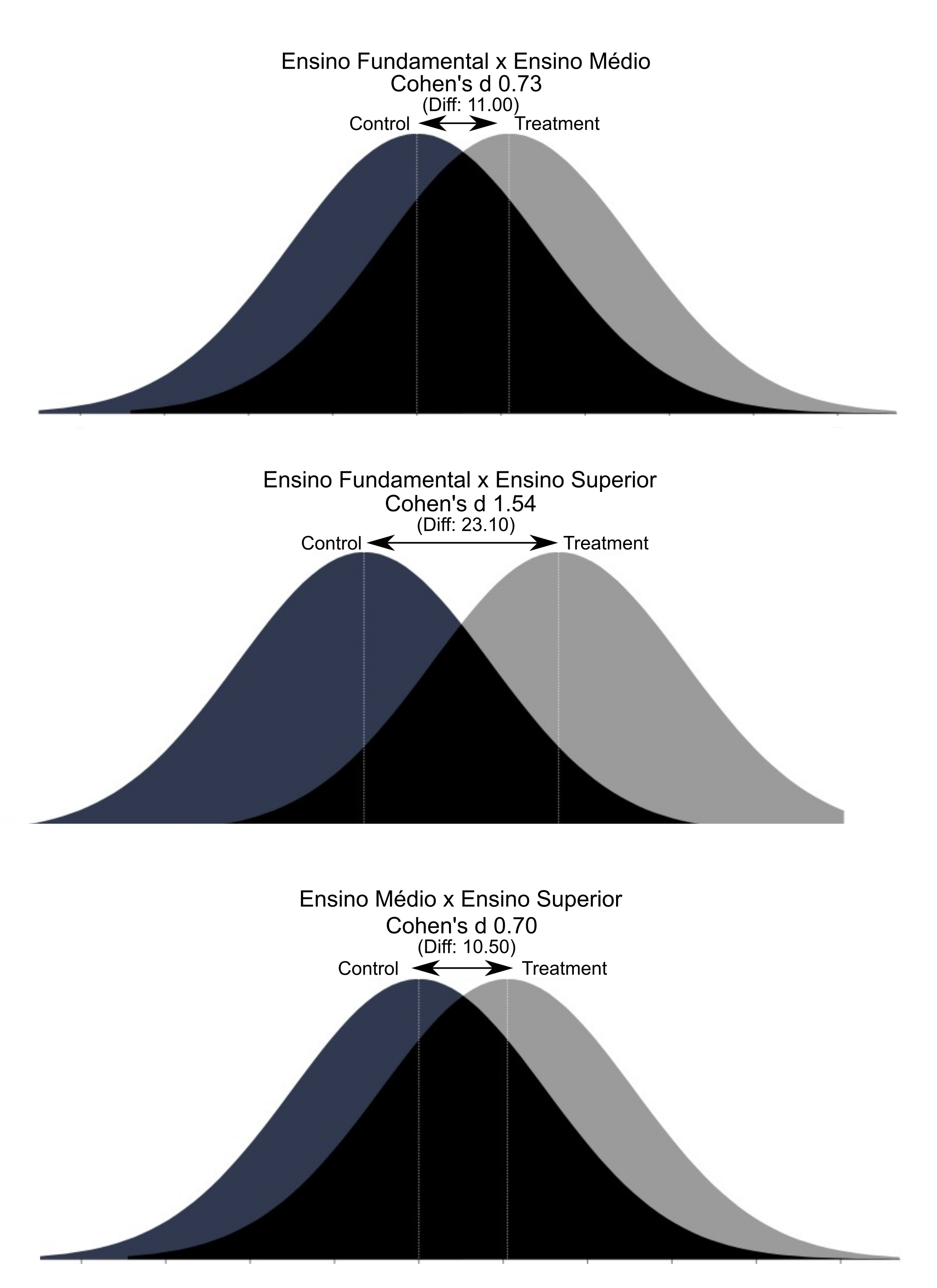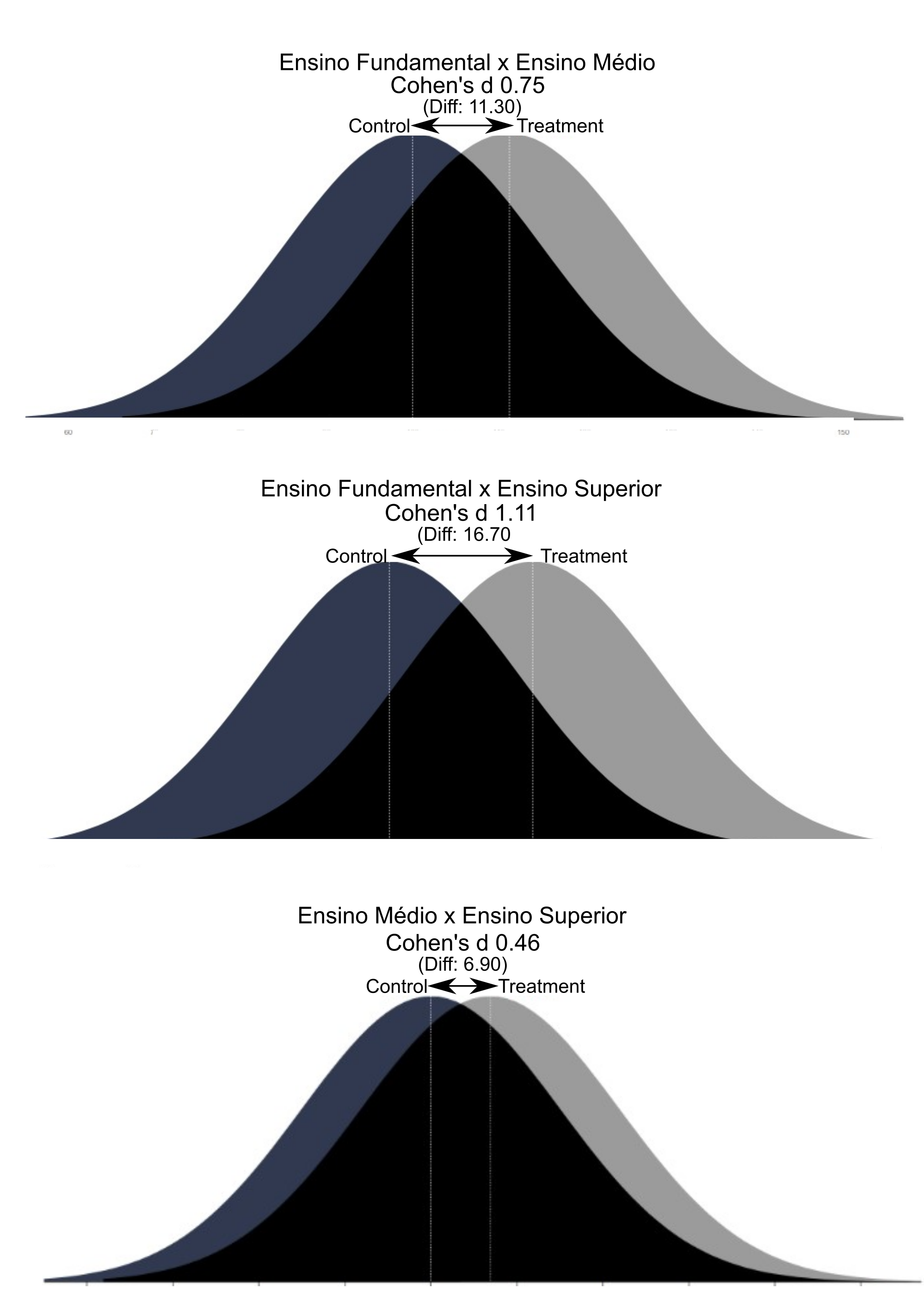 Um . de 0.75 (IC 95% = 0.69, 0.82) foi apurado entre os níveis de ensino fundamental (. = 24.17, DP = 6.33) e médio (. = 28.80, DP = 5.03). Com base nesse TDE, o .. de Cohen apontou que 77.3% dos indivíduos do grupo com ensino médio estarão acima da média do grupo com nível fundamental. Assim, haverá uma sobreposição de 70.8% entre os dois grupos, e 70.2% de chance de uma pessoa escolhida aleatoriamente no grupo com ensino médio ter uma pontuação maior do que uma pessoa escolhida aleatoriamente no grupo com nível fundamental (probabilidade de superioridade).
