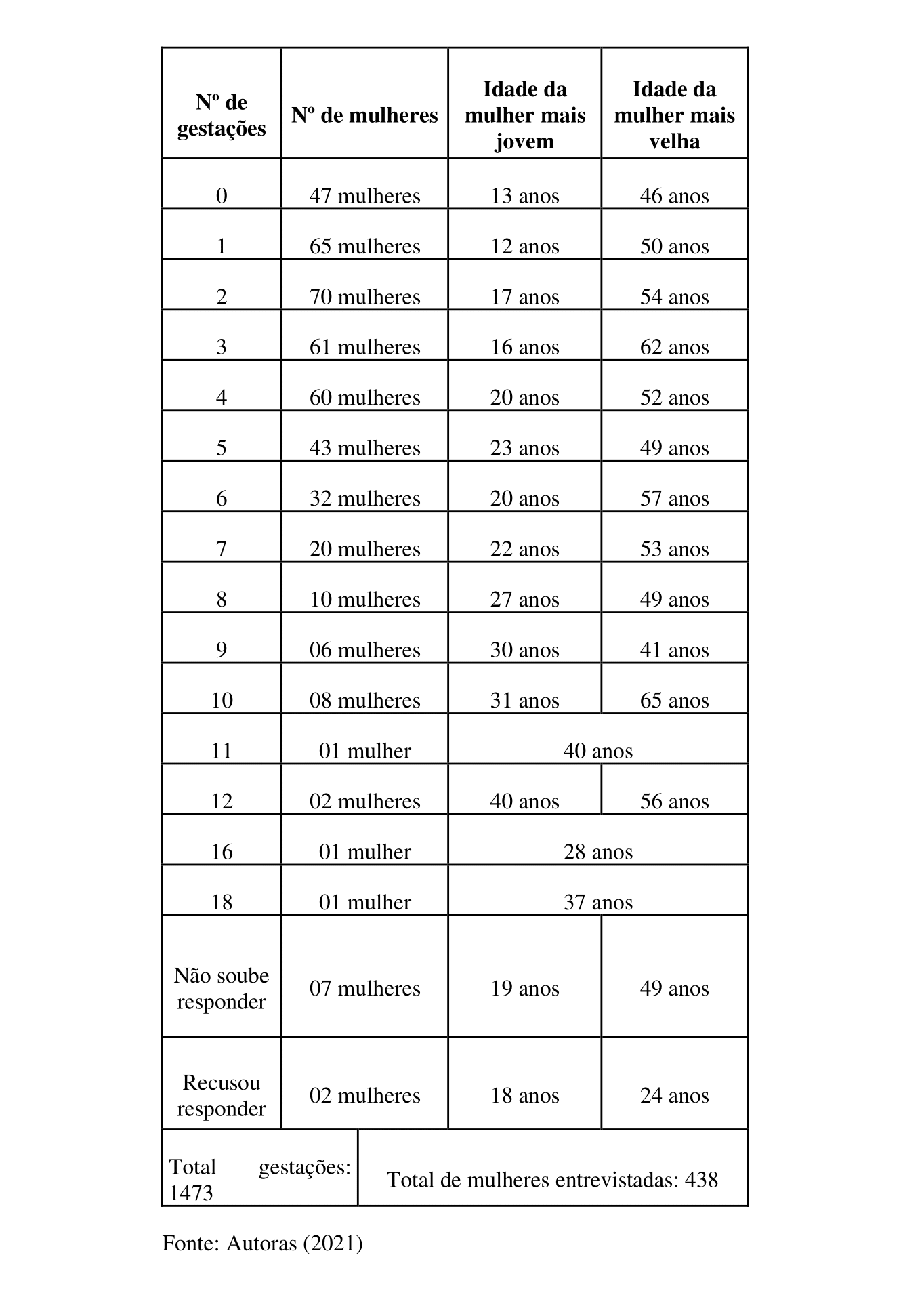 O resultado deflagra necessidades urgentes em políticas públicas e que essas propostas se articulem em rede de proteção e cuidado através de ações voltadas para a prevenção, assim como a ampliação e a priorização no acesso dessas mulheres ao planejamento familiar e aos cuidados de saúde vinculados ao Sistema Único de Saúde (SUS). Para melhor visualização dos dados colhidos, elaboramos o Quadro 1. Nele apontamos o número de gestações distribuído pelo total de mulheres entrevistadas, destacando a idade da mais jovem e da mais velha em cada categoria.