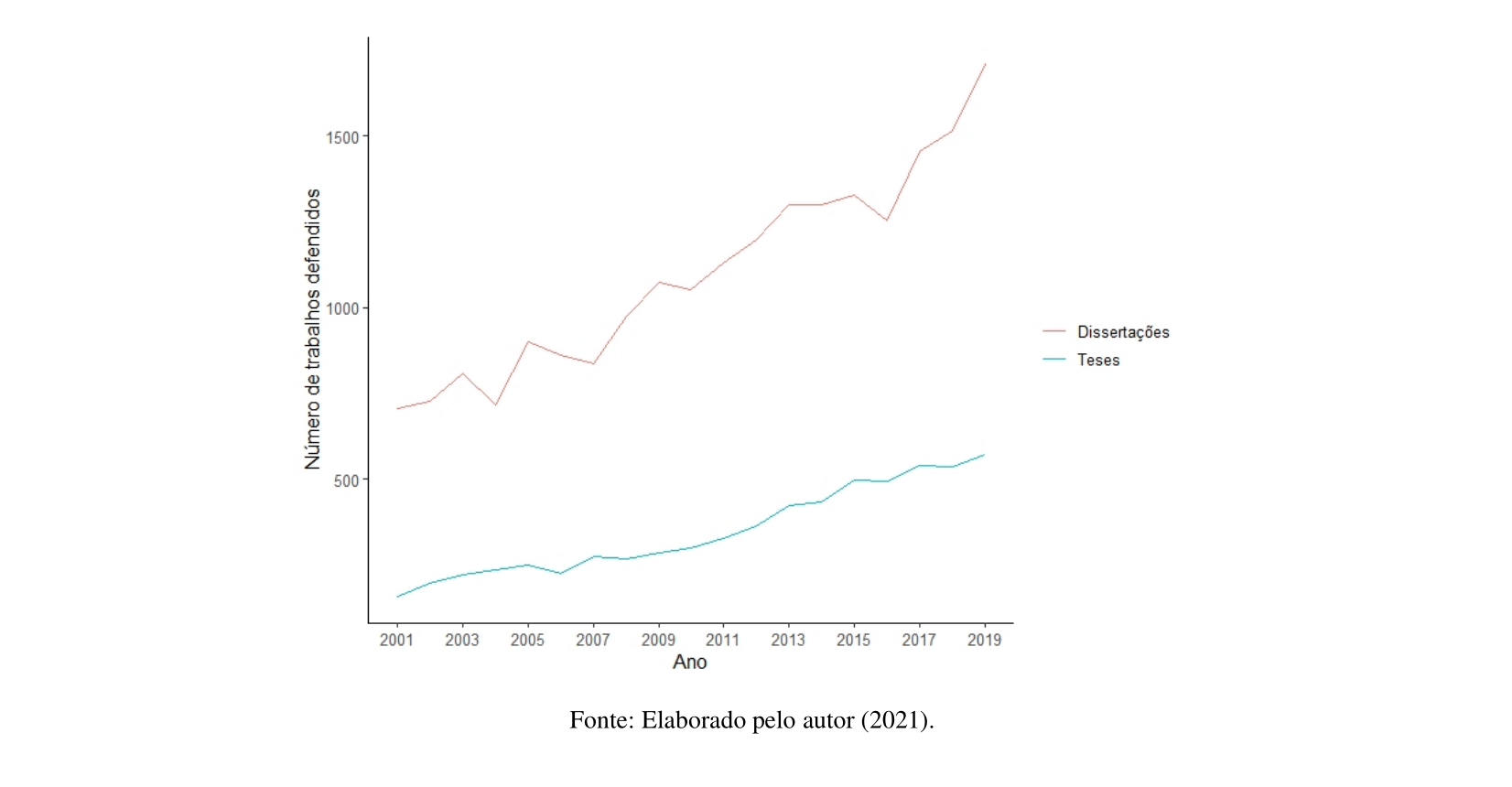 O número de teses e dissertações defendidas por ano pode ser vista na figura 1. A tendência de crescimento nestes anos se mostra evidente no gráfico. Foi possível verificar uma taxa de crescimento anual de 5,55% no total de produções. Os tipos de publicação aparecem discriminados por cores, sendo o crescimento visto tanto nas dissertações quanto nas teses.