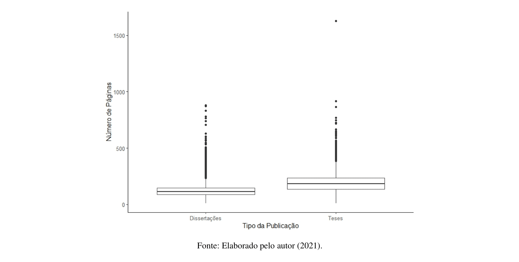 No que tange as diferenças entre os números de páginas de teses e dissertações, a maior extensão das teses se mostrou bastante evidente, dentre os motivos dessa realidade pode ter ligações com o tempo de duração do curso e a maior experiência acadêmica do discente de doutorado. Não se pode determinar a qualidade de um estudo pelo número de páginas, entretanto, Xie et al. (2019) analisou dados de 1.548.088 artigos acadêmicos e constatou uma correlação positiva de maior tamanho do artigo e número de citação, e este último é encarado na ciência como um indicador de relevância da publicação, mesmo o estudo sendo feito de artigos acadêmicos, pode-se esperar uma realidade parecida com as teses e dissertações, visto que se trata também de comunicações científicas.