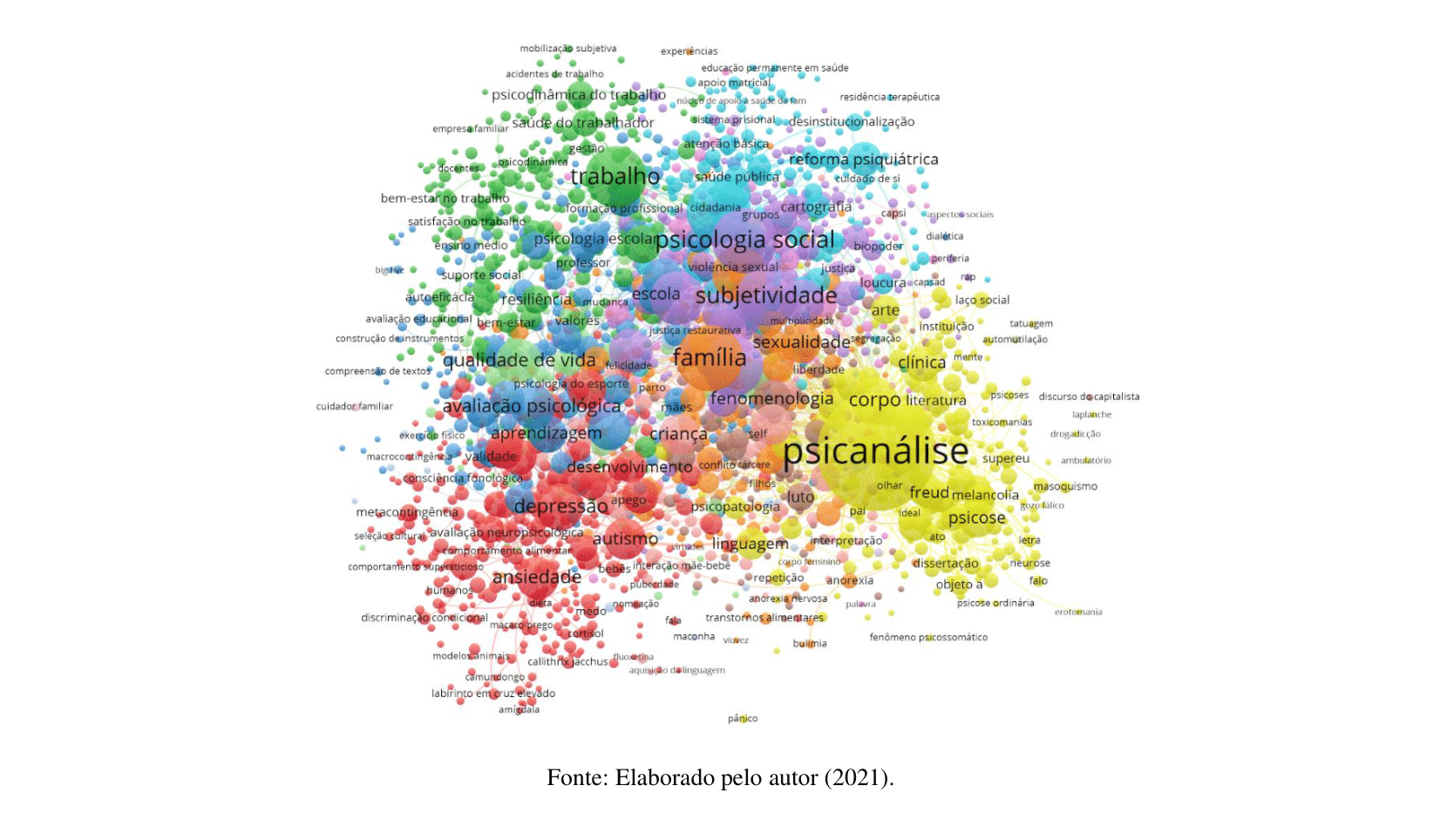 As palavras-chaves ligadas a teoria psicanalítica orbitam o termo “Psicanálise”, com a cor amarela, vê-se a relação de ocorrência sejam por se tratar de autores da área (Freud, Lacan, Winnicot), conceitos (pulsão, objeto a, psicose) ou temas de interesse dos teóricos da área. A palavra-chave “Psicanálise” se apresentou como a mais frequente, pode-se relacionar com o fato de ser uma área teórica criada próximo ao surgimento da Psicologia enquanto ciência, sendo assim uma das vertentes mais tradicionais para o entendimento do ser humano, e desde então, se desenvolveu com diversas correntes. Uma pesquisa realizada por Bastos e Gomide (1989) sobre a atuação dos psicólogos realizada no final da década de 1980 apontava a Psicanálise como a linha teórica mais utilizada pelos psicólogos, com o total de 37,1%. Neufeld e Carvalho (2017), em uma publicação sobre a realidade da Psicologia Clínica na América Latina, também apontam a hegemonia da Psicanálise sobre outras teorias. Conforme já sinalizado na seção de resultados, não se pode afirmar a abordagem teórica de um trabalho somente pelas palavras-chaves, entretanto, podemos verificar através dos dados levantados que a Psicanálise tem uma presença expressiva na pós-graduação em Psicologia brasileira.