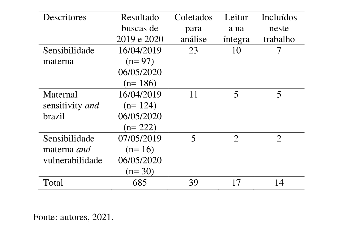 A busca foi realizada de abril a maio de 2019, utilizando como escopo pesquisas publicadas num intervalo dos últimos 5 anos (2014-2018). Em razão do ínfimo número de resultados, efetuou-se nova busca em maio de 2020, ampliando para os últimos 10 anos (2010-2020). Em ambas, foram acessados artigos publicados apenas em periódicos científicos, na plataforma do Portal CAPES e nas bases de dados BVS Brasil e SciELO. As palavras-chave utilizadas nessa pesquisa foram: “sensibilidade materna”, “maternal sensitivity and brazil” e “sensibilidade materna and vulnerabilidade”.