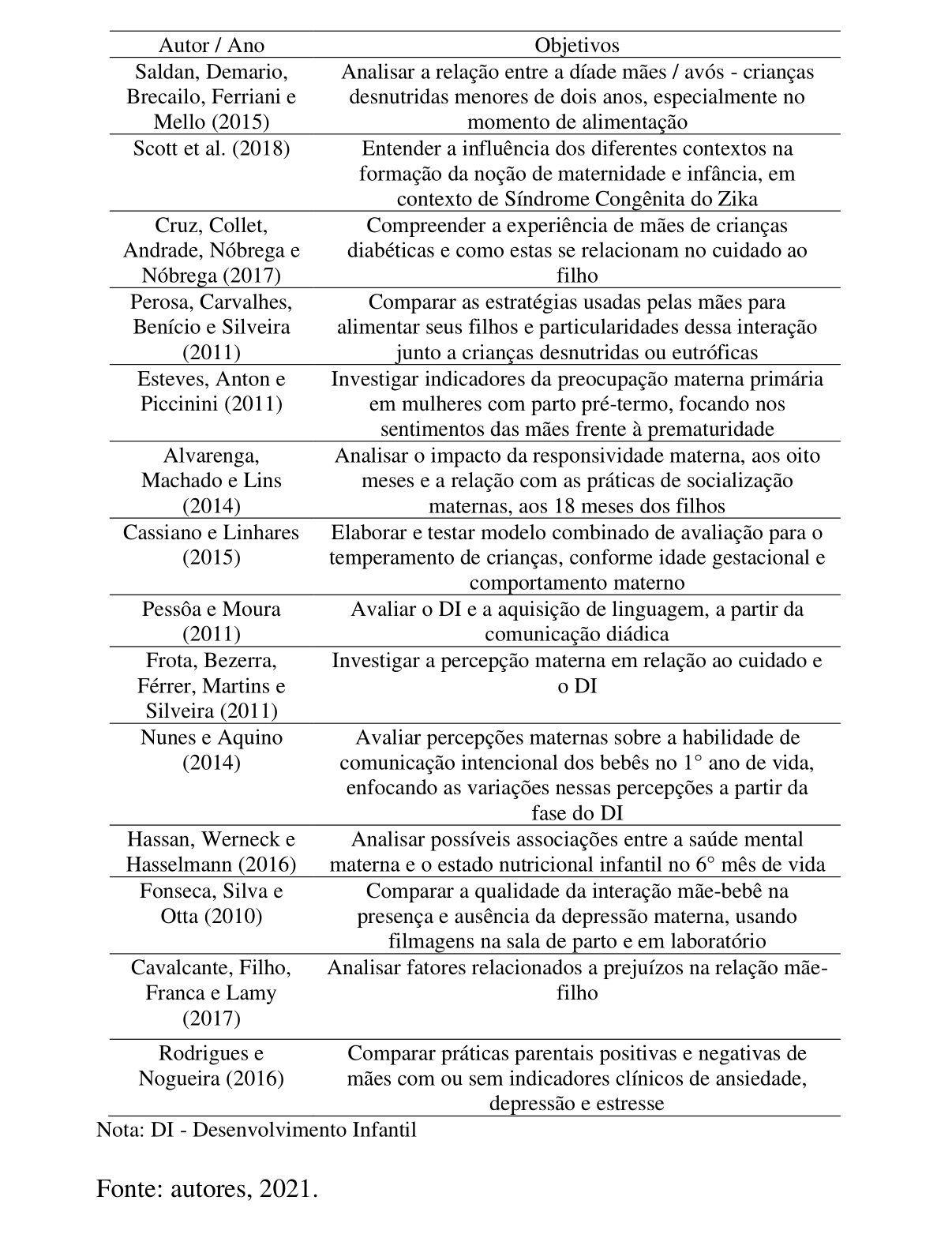 Dos 17 artigos elegíveis à análise, somente 14 atenderam aos critérios de inclusão e ao tema proposto nesta pesquisa, como pode ser visualizado na tabela 2. A maioria dos artigos analisados não discutem diretamente a sensibilidade materna, mas abordam, em seus resultados, condições associadas à temática.