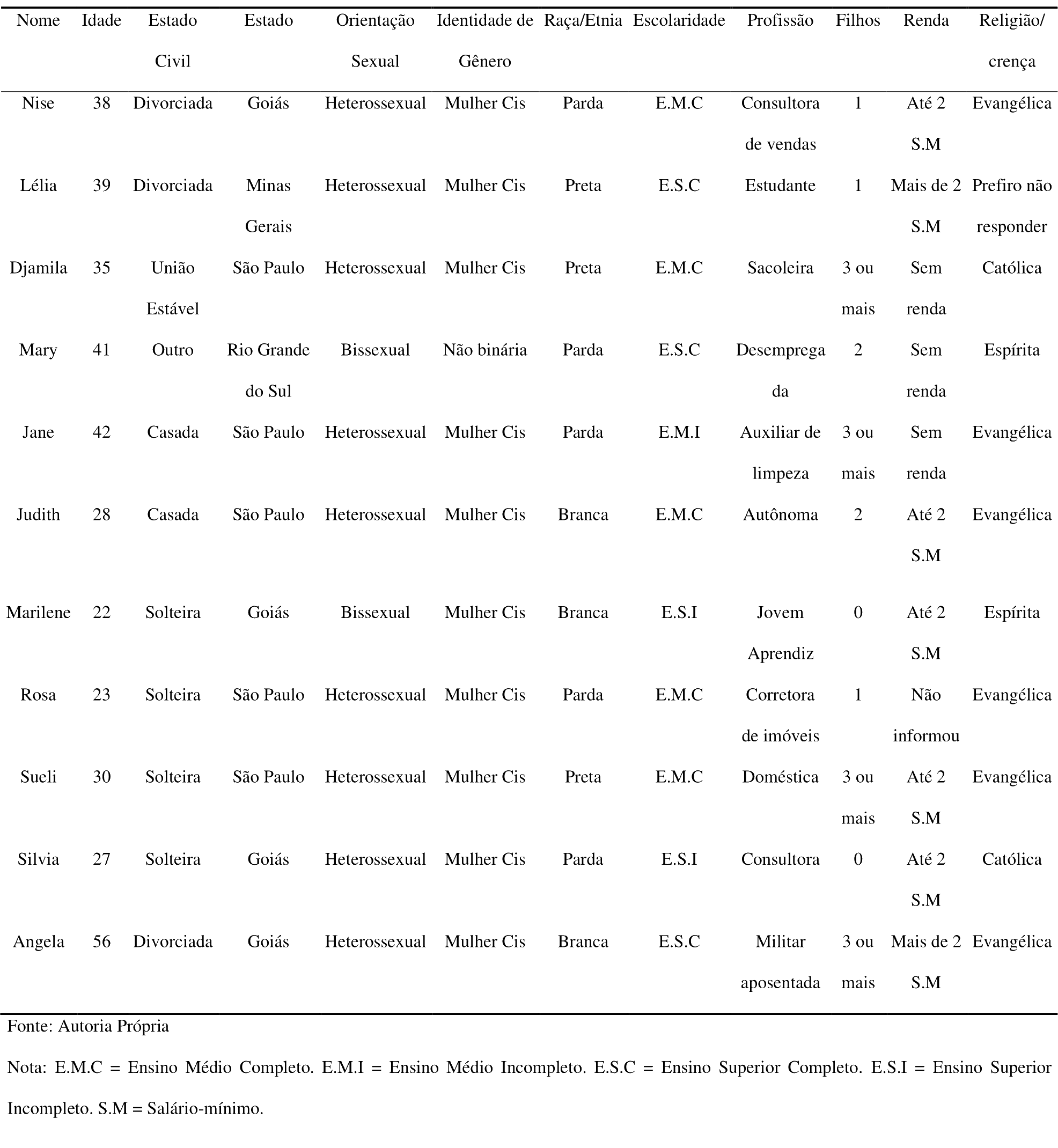 Em relação ao perfil identitário das participantes, a idade variou entre 22 e 56 anos. Em relação ao estado civil, 36,3% (n=4) eram solteiras, 27,3% (n=3) divorciadas e casadas respectivamente, e 9,1% (n=1) estavam em união estável. Em relação a localidade, 45,4% (n=5) residiam no estado de São Paulo, 27,3% (n=3) em Goiás, 9,1% (n=1) em Minas Gerais e no Rio Grande do Sul respectivamente. Quanto a orientação sexual, 81,8% (n=9) identificaram-se como heterossexuais e 18,2% (n=2) bissexuais. Em relação à identidade de gênero, 90,9% (n=10) se identificavam como mulheres cisgênero e 9,1% (n=1) como não binária. No que se refere à escolaridade, 45,4% (n=5) possuíam ensino médio completo, 27,3% (n=3) ensino superior incompleto, 18,2% (n=2) ensino superior completo e 9,1% (n=1) ensino médio incompleto. No que se refere ao número de filhas/os, 36,3% (n=4) possuíam 3 ou mais, 27,3% (n=3) um/a, 18,2% (n=2) duas/ois ou nenhum/a. A respeito da renda familiar, 45,4% (n=5) recebiam dois salários-mínimos, 27,2% (n=3) não tinham renda, 18,2 (n=2) mais de dois salários-mínimos e 9,1% (n=1) preferiram não responder. Acerca da religiosidade ou crença, 54,5% (n=6) eram evangélicas, 18,2% (n=2) católicas, 18,2% (n=2) espíritas, 9,1% (n=1) optou por não responder, conforme Tabela 1.