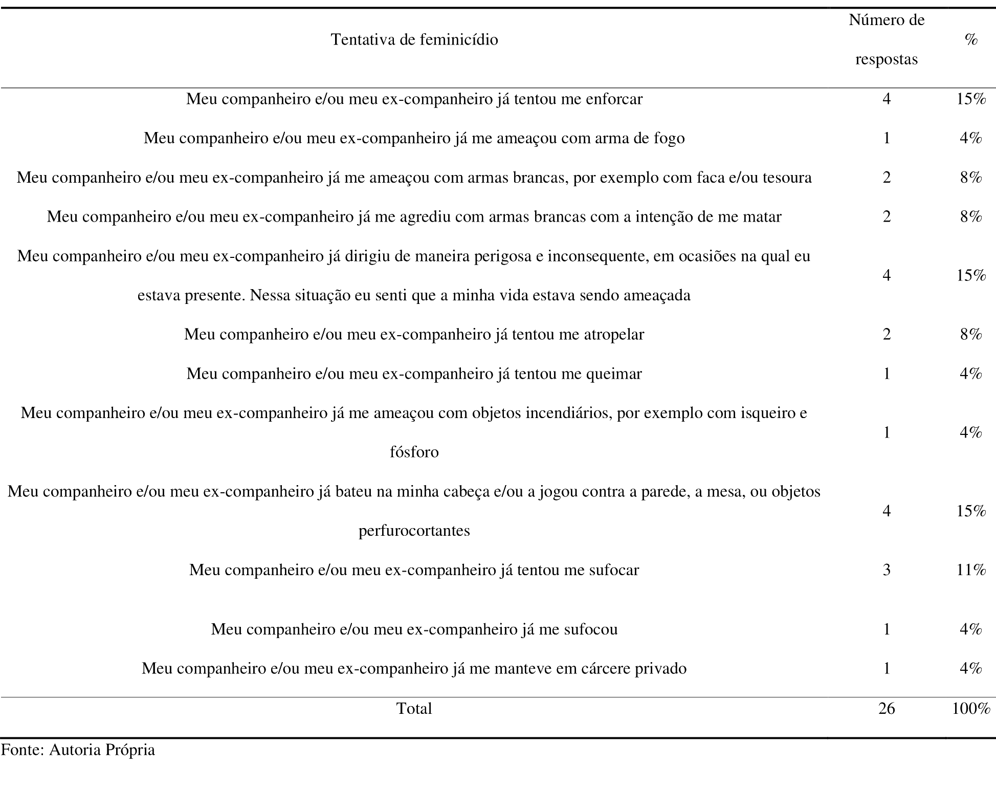Identificamos que 81,8% (n=9) das participantes mantinham relação afetiva-sexual com o autor da agressão na ocasião das tentativas de feminicídio. A literatura revela que em 58% dos feminicídios consumados os autores eram companheiros das vítimas (Distrito Federal, 2020), ou seja, as mulheres foram assassinadas por alguém com quem mantinham vínculo íntimo de afeto. Foram múltiplas as tentativas de feminicídio vivenciadas pelas participantes e se deram, predominantemente, por meio de enforcamento (15%, n=4), direção perigosa pelo (ex)parceiro (15%, n=4) e bater a cabeça em locais ou objetos perfurocortantes (15%, n=4), conforme Tabela 2. No caso das tentativas de feminicídio por enforcamento e/ou bater na cabeça, estão vinculadas à ideologia patriarcal forjada na concepção de que os corpos femininos pertencem ao homem (Pasinato, 2016; Zanello, 2018).