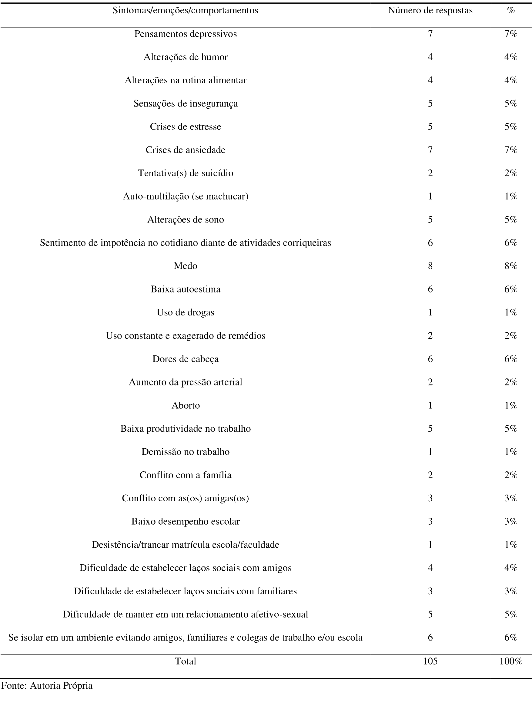 Quanto a intersecção entre a vivência das tentativas de feminicídio e os impactos na saúde mental, identificamos múltiplas vivências que afetaram a vida cotidiana, a subjetividade e as relações sociais das participantes. Entre os impactos na dimensão física da vida, observamos o aumento da pressão arterial (2%, n=2), automutilação (1%, n=1), dores de cabeça (6%, n=6), tentativa de suicídio (2%, n=2), aborto (1%, n=1), uso de drogas (1%, n=1) e uso constante de remédios (2%, n=2). Quanto aos impactos na dimensão social, as participantes indicaram fragilização dos laços familiares (3%, n=3) e de amizade (4%, n=4), conflitos com família (2%, n=2) e amigas/os (3%, n=3), baixa produtividade no trabalho (5%, n=5) e na escola (3%, n=3), demissão do trabalho (1%, n=1), trancamento/desistência de matrícula (1%, n=1), dificuldades em se relacionar com outros/as parceiros/as (5%, n=5) e isolamento (6%, n=6). No que concerne os impactos emocionais, verificamos pensamentos depressivos (7%, n=7), crises de ansiedade (7%, n=7), estresse (5%, n=5), alterações do sono (5%, n=5) e na rotina alimentar (4%, n=4), impotência frente atividades cotidianas (6%, n=6), insegurança (5%, n=5), medo (8%, n=8) e baixa autoestima (6%, n=6), conforme tabela 3.