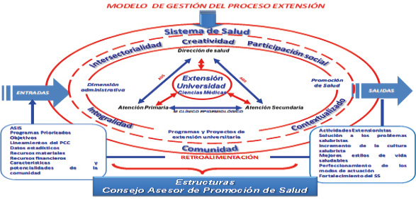 Se estructura un modelo del proceso de gestión de la extensión en las universidades de Ciencias Médicas que permite la interrelación con los diferentes niveles estructurales, integrado al sistema de salud y en su vínculo estrecho con la comunidad a partir de la relación entre sus dos dimensiones: la administrativa y la de promoción de salud.