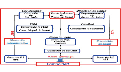 Entre la Universidad de Ciencias Médicas, la Dirección de Salud Provincial, las facultades, policlínicos universitarios, la Dirección Municipal de Salud, los departamentos y las restantes áreas, carreras y el año académico se da una relación dialéctica en la gestión de la extensión universitaria. Si bien la academia integrada al sistema de salud tiene la función de optimizar el proceso extensionista desde la promoción de salud y articularlo desde las exigencias del entorno para la contribución al desarrollo cultural salubrista y modificar favorablemente los estilos de vidas de la comunidad, las facultades buscan la excelencia desde las exigencias del Modelo del Profesional y del entorno; mientras que los departamentos trabajan en función de las necesidades específicas de cada carrera y disciplina en su vínculo estrecho con la atención primaria y secundaria de salud, fomentando la promoción de salud de acuerdo a las necesidades planteadas por las mismas, en el caso de las restantes áreas desde la perspectiva de sus áreas de actuación.