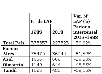 Tabla 1: Cantidad de EAP y variación porcentual intercensal para los relevamientos del CNA 1988 y CNA 2018. Total País, provincia de Buenos Aires y los partidos de Azul, Olavarría y Tandil.