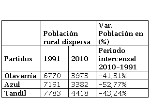 De la misma manera disminuyen los valores de la población rural. Comparando los valores de la población rural dispersa para los censos nacionales de Población (CNP) 1991 y 2010, se puede observar en la Tabla 2 que en 20 años se redujo prácticamente a la mitad. Los resultados arrojan una disminución del 52,77% para Azul, del 43,24% para Tandil y del 41,31% para Olavarría.