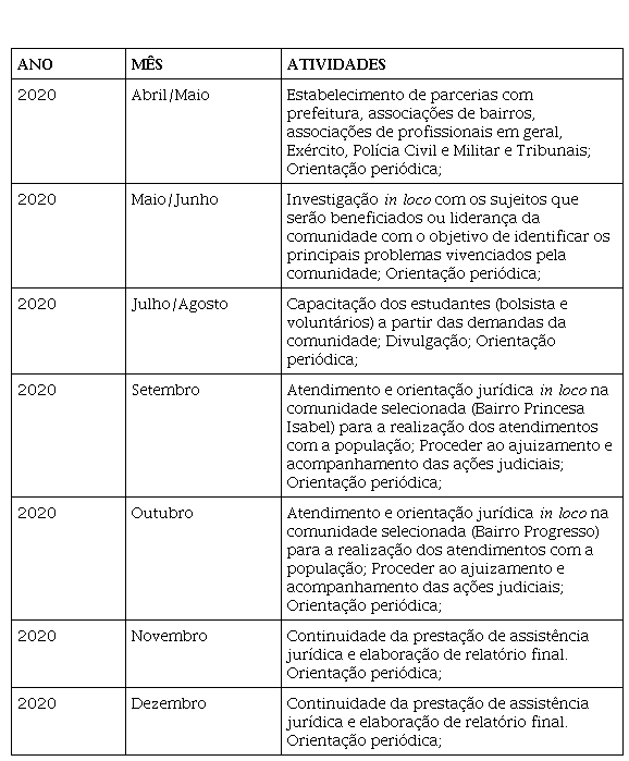 A princípio, o almejado era identificar as demandas com maior incidência na comunidade, buscando o embasamento teórico necessário para a prestação de serviço específico. Com o andamento do projeto, foram necessárias algumas adaptações no emprego da metodologia, tendo em vista, a pandemia e a clarificação em proporcionar celeridade na satisfação do direito dos interessados.