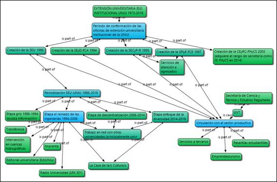 En la Figura 1 se muestra la vista de red de categorías, confeccionada con ATLAS.ti, que sintetiza los principales aspectos de continuidades y discontinuidades entre las oficinas de extensión de la UNJU entre 1996 y 2018.