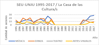 La revisión de las memorias y las vistas de red de ATLAS.ti, que evidencian una compleja estructura categorial a excepción de la gestión que va de 2006 a 2014, muestran que el común denominador de las conducciones fue, justamente, La Casa de la/s Cultura/s. La misma desarrolló su actividad a través de cuerpos estables y talleres permanentes o auspiciados. Todos estos surgían eventualmente desde la universidad o eran propuestos por miembros u organizaciones de la comunidad extrauniversitaria que, por su interés, eran apoyados por la universidad. Si se examina por ejemplo el caso de la Secretaría de Extensión Universitaria de la Universidad Nacional de Cuyo, durante el primer peronismo hace más de sesenta años (Gothef, 1992), se verá que la lógica no es tan diferente respecto de lo que ocurrió con la UNJU en un período mucho más contemporáneo. Cuando se observa cómo se fueron organizando, a través de los años, las actividades de la Casa de la/s Cultura/s se puede abstraer un reagrupamiento que es por disciplinas artísticas. Las actividades se concentraron principalmente en cuatro disciplinas: música, danza, teatro y plástica. En música mayoritariamente en el coro universitario, el taller de instrumentos regionales y hacia el final del período –que va hasta 2018– bandoneón, grupos de cámara, ensamble instrumental y clínica musical; en danza en el ballet (folclórico) y el taller de tango y milonga; en teatro las funciones del elenco de la UNJU, el taller homónimo, algo de títeres y más ocasionalmente mimos; en artes visuales el taller de dibujo y pintura con exposiciones de artistas plásticos intra o extra UNJU, cerámica y algo de fotografía. En la Figura 2 se puede tener una idea de las fluctuaciones a través de los años de los renglones de la cultura más abordados, reagrupados por disciplinas, entre 1996 y 2018. Cabe aclarar que allí se han considerado como unidades de acción a cada uno de los cuerpos estables, talleres permanentes o auspiciados y las actividades generadas por dentro o por fuera de ellos.