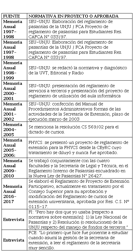 Los aspectos comunes a la SEU-UNJU y las áreas de extensión de facultades muestran, hasta 2018, la ausencia de una normativa específica, es decir, un reglamento integral para estructurar la extensión universitaria centralizada o de las facultades. Las reglamentaciones parciales redundan en aspectos vinculados a pasantías y cursos, en sentido genérico, lo que reafirma la orientación tradicional cursista de este período. En la Tabla 1 se puede observar lo que se obtuvo al respecto.