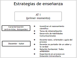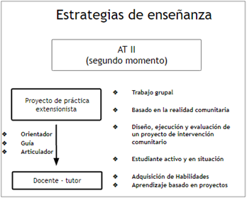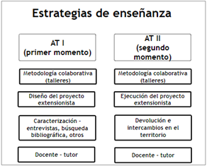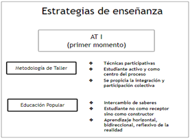 En tal sentido se pueden identificar dos grandes aspectos institucionales que atraviesan AT: los contenidos del plan de estudios del 2008 y la Segunda Reforma Universitaria. Tanto el plan y la reforma remiten a cambios profundos en cuanto a las formas de construcción de los procesos de enseñanza ya que, entre otras cosas, implican una curricularización de la extensión que invita a pensar nuevas estrategias de enseñanzas donde ‘el otro’ y su entorno cobran un papel central. Es así como, desde la perspectiva del proceso de enseñanza, éste implica un aprendizaje en los estudiantes que se desarrolla en el encuentro con las personas y su realidad. Esto posibilita al estudiante integrar conocimientos teórico-metodológicos en la comprensión y aportes a problemas concretos en la vida cotidiana de las personas y las comunidades; adquiriendo al mismo tiempo habilidades y comportamientos que hacen al trabajo en territorio en contacto con las personas. El curso de AT implica pararse epistemológicamente desde la complejidad y la multideterminación de los fenómenos a la hora de diseñar las estrategias de enseñanza, ya que es el mismo territorio el que imprime en nuestras prácticas toda su dinámica. Como ideas centrales que se encuentran en todas las acciones de enseñanza diseñadas en AT encontraremos la construcción interdisciplinaria, el aprendizaje constructivista y colaborativo, la integración de las habilidades comunicacionales, el apoyo de las tecnologías de la información y comunicación (TICs) y la adaptación del método de aprendizaje basado en proyectos (Díaz Barriga y Hernández Rojas, 2010).