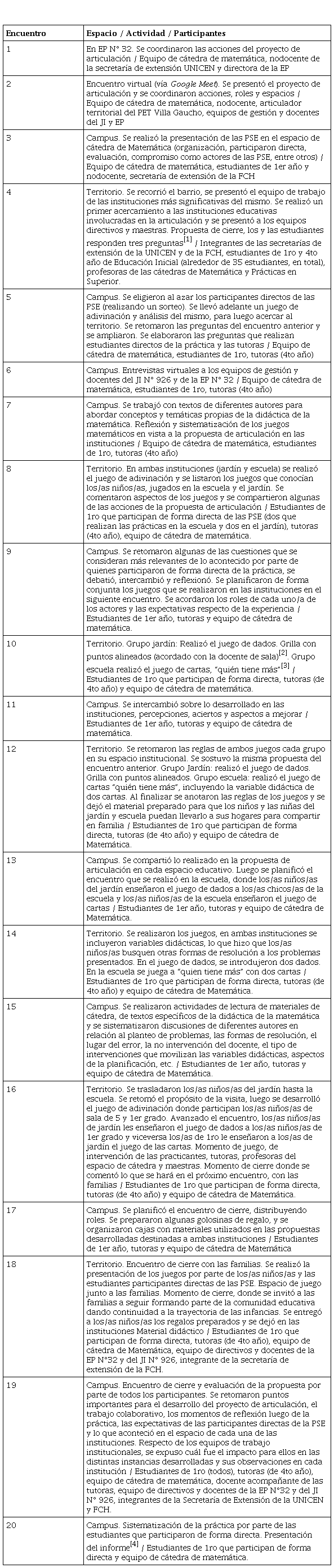 Los encuentros que se describen a continuación se relacionan con los distintos espacios que se sostuvieron durante las prácticas, los participantes y las actividades realizadas, y que incluyeron, tal como plantea el reglamento de las PSE de la FCH, situaciones de: sensibilización, conceptualización, problematización, reflexión, intervención con la comunidad específica y sistematización de la experiencia. En la Tabla 1 se presenta una síntesis de los 20 encuentros que implicó la realización de las PSE. Esta sistematización permite dar cuenta de cómo la práctica extensionista habita vastos y diversos territorios.