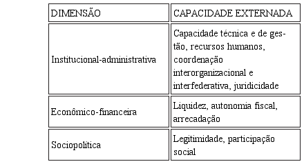 A dimensão institucional-administrativa da capacidade estatal externa de forma satisfatória alguns tipos de capacidades ligadas a questões como técnica, gestão e recursos humanos. Nessa dimensão estão, ainda, as capacidades de desenvolver relações de coope- ração com organizações não governamentais e com outros entes federativos, visando a atender interesses públicos comuns. Na dimensão econômico-financeira, as capacidades que devem ser externadas, para que se efetive a capacidade estatal, dizem respeito à autonomia fiscal e de arrecadação tributária, além daquela relativa à liquidez para o cum- primento das obrigações assumidas. Por fim, a dimensão sociopolítica deve exteriorizar a capacidade estatal de produzir políticas públicas dotadas de legitimidade democrática, em termos de participação social.