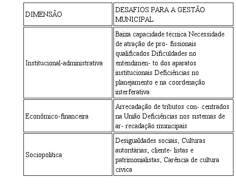 Com base nessas premissas, é possível avançar para um comparativo entre as dimensões das capacidades estatais trabalhadas acima e os desafios a serem enfrentados pelos municípios em cada uma destas dimensões para que estes possam formular políticas públicas democráticas, eficientes e efetivas, como se apresenta no quadro abaixo: