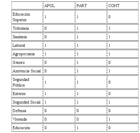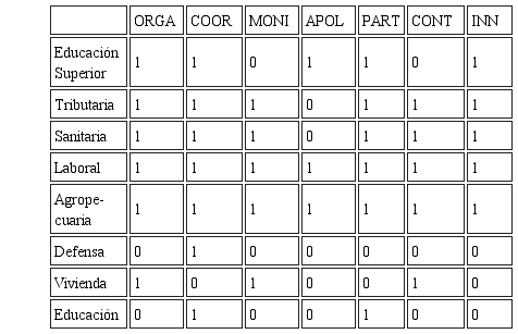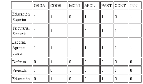 En una configuración contamos con la presencia de dos capacidades técnico-administrativas (la presencia de las burocracias gubernamentales profesionalizadas y el funcionamiento de mecanismos de coordinación intra-gubernamental), en ausencia de procedimientos de monitoreo, y con la presencia de dos capacidades político-relacionales (interacciones institucionalizadas entre actores burocráticos y agentes parlamentarios de diversos partidos, y existencia y funcionamiento de mecanismos de participación social). Este es el caso de la educación superior.