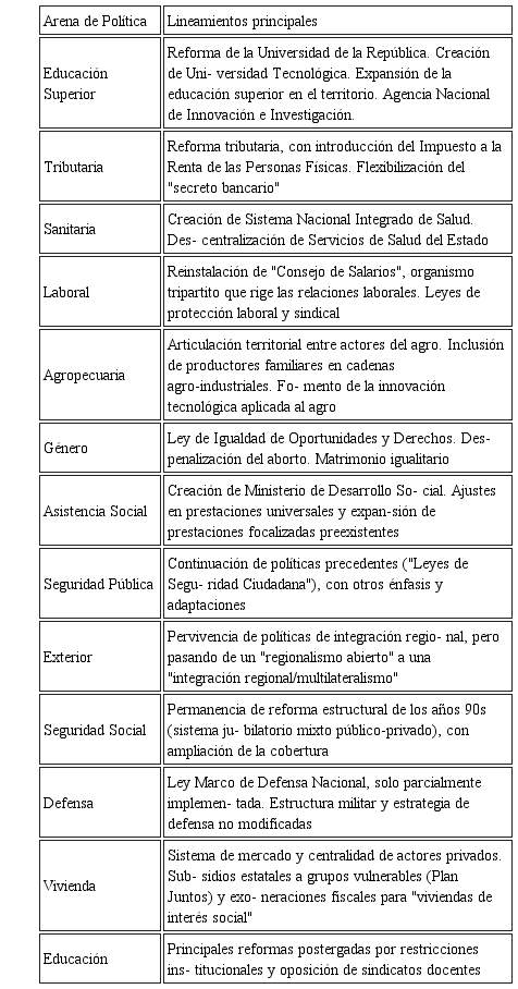 Si se contempla la impronta transformadora del Frente Amplio en el marco de las arenas de políticas seleccionadas en toda su complejidad y diversidad, debe concluirse que se caracteriza por una gran dispersión, entre registros constituyentes o re-configuradores en algunas de ellas, y meramente adaptativos en otras. Por un lado, se establecieron nuevas institucionalidades y reglas de juego para sectores y temáticas de gran relevancia política y social. Por otro, algunas de las reformas características de las políticas de los años noventa fueron asimiladas (seguridad social) o no se hallaron fórmulas para su sustitución (educación).Y en amplios espacios, se operó con la estrategia de incorporar nuevas capas de políticas sobre las ya existentes (Mahoney;Thelen, 2010).