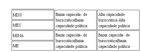 Tendo por base esses critérios, bem como ponderando o total de casos a serem analisados no âmbito desse artigo, foram elegidos no total quatro órgãos para estudo (Quadro 1): o Ministério do Desenvolvimento Social e Combate à Fome (MDS); o Ministério da Educação (MEC); o Ministério da Integração Nacional (MINA); e o Ministério dos Esportes (ME). Inicialmente, no primeiro ano pesquisado pelo autor, esses quatro órgãosmostravam baixas capacidades políticas e burocráticas no domínio de suas ações e operações. Já ao final do período analisado, dois foram capazes de ascender à categoria de altas capacidades (MDS e MEC) e os outros dois permaneceram na categoria de baixas capacidades (MINA e ME).