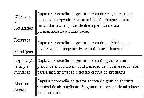Quando analisamos o primeiro parâmetro, Objetivos e Resultados, observamos que, na percepção de seus respectivos gestores, os programas desenvolvidos por MDS e MEC obtiveram alcance satisfatório de resultados, ao passo que aqueles desenvolvidos por ME e MINA obtiveram resultados muito abaixo do esperado. Pelo menos essa variável já tende a condizer com a análise anterior que nos mostrou que o desenvolvimento institucional de MDS e MEC foi muito mais linear e consistente do que dos outros dois órgãos, levando-os a potencializar melhor capacidades burocráticas e políticas.