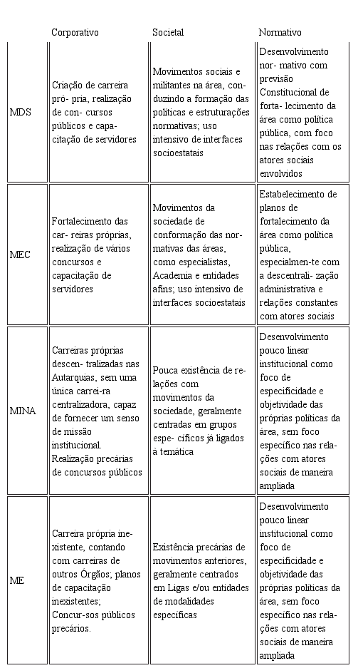 Em suma, podemos dizer que, factualmente, os órgãos aqui analisados diferem sobre- maneira no seus respectivos desenvolvimentos histórico-institucionais, seja em termos de conformação de um corpo burocrático consistente, seja na conformação de capacidades políticas fortes. O que importa concluir a partir dessa comparação é que a situação atual de gestão de cada qual, bem como suas perspectivas futuras de desenvolvimento institucional e da própria área, são, em grande medida, repercussões desses processos históricos de estruturação. A existência de movimentos da sociedade afetos e militantes nas áreas e aconformação institucional dessas políticas pode levar a uma situação de melhores capacidades políticas e burocráticas. Esses são fatores que concorrem para um desenvolvimento institucional de caráter mais linear e sistematizado, bem como para um corpo burocrático capaz de gerir as políticas de maneira mais voltada aos atores sociais de uma maneira geral.
