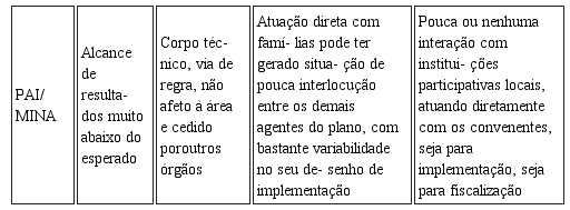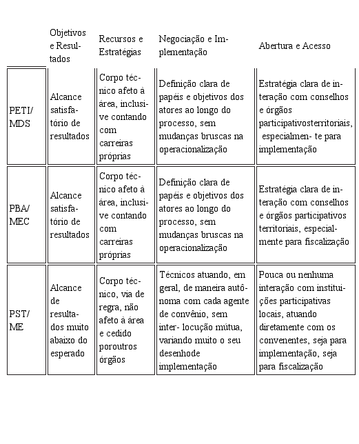 Primeiro, a transversalidade institucional, focada justamente na existência de arenas híbridas, compostas por Estado e sociedade, como seu principal fator de sucesso.A segunda característica faria referência ao escopo de execução no âmbito municipal. Em geral, municípios de menor porte, que são justamente aqueles nos quais são encontradas com maior frequência as situações de trabalho infantil, não teriam uma estrutura burocrática consolidada e forte. As dificuldades decorreriam do desconhecimento da temática por parte dos gestores locais, bem como da falta de comprometimento com prazos de prestação de contas e de elaboração de relatórios técnicos de progresso. Além disso, foi relatada muita rotatividade nas equipes locais.