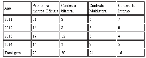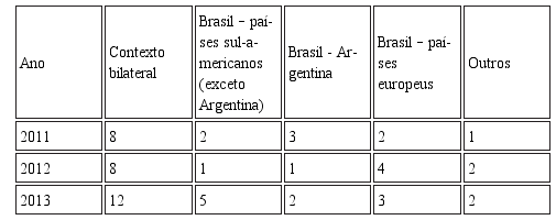 Percebe-se na tabela acima que o Mercosul foi citado mais no contexto bilateral do que no contexto multilateral e que o ano de 2011, primeiro ano do mandado da presidente Dilma Rousseff, foi o mais intenso em relação à quantidade de discursos no qual a palavra Mercosul tenha sido citada. Houve uma escolha para onde falar do Mercosul e a motivação. De certa forma os dados corroboram as afirmações expostas no primeiro tópico do texto. O Mercosul é relevante, é considerado como uma plataforma estratégica política e econômica, mas limitado regionalmente.