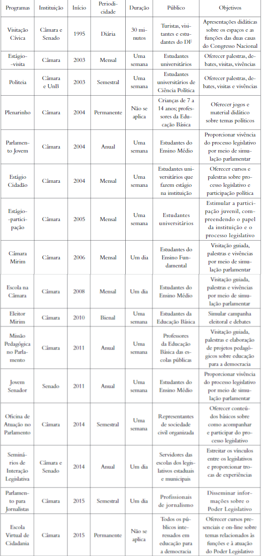 Convém explicitar aqui que foram incluídos no Quadro 1 todos os programas de educação para a democracia mantidos continuadamente pelas duas instituições, independentemente do órgão responsável pelo seu gerenciamento. Em diversas instituições públicas e privadas, os programas educativos são desenvolvidos tanto pelas áreas de recursos humanos e de treinamento como também pelas áreas de marketing e de relações públicas, nas quais são considerados “ações de comunicação” e objetivam a difusão da “missão institucional”para a melhoria da percepção e da imagem da instituição.No caso do Congresso Nacional, a compreensão do papel institucional está diretamente ligada à educação para a cidadania. Nesse sentido, é importante ressaltar que nem todos são mantidos pelas escolas do legislativo em nível federal (CEFOR e ILB). No caso da Câmara dos Deputados, há programas considerados como de educomunicação e que, por isso, são gerenciados pela Secretaria de Comunicação (SECOM), como o Plenarinho e a Visitação.