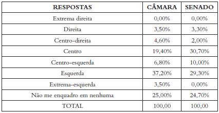 Em termos de perfil ideológico, há um predomínio de informantes que se autodeclaramcomo de esquerda, centro e “não me enquadro em nenhuma”, como mostra a Tabela 9. Nãohá registros expressivos de educadores nos extremos do espectro ideológico-partidário, ouseja, nem extrema-direita nem extrema-esquerda. Considerando efetivamente os registrosque se enquadram na classificação convencional, há uma leve diferença entre o perfil dosrespondentes da Câmara e do Senado. No primeiro caso, prevalece quem se consideraesquerda (37,20%); no Senado, a preponderância é de centro (30,70%).