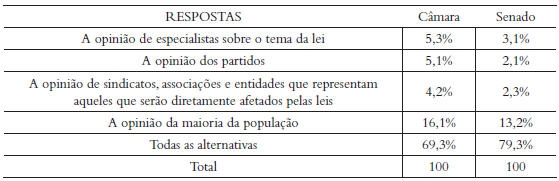 Consultados sobre as opiniões que deveriam ser levadas em conta na propositura denovas leis ou na alteração da legislação já existente, a maioria dos educadores optou pelaresposta “todas as alternativas”, como mostra a Tabela 10. Isso implica levar em conta aopinião de especialistas sobre o tema das leis, a opinião dos partidos políticos, a opiniãode sindicatos, associações e entidades que representam aqueles que serão diretamenteafetados pelas leis e a opinião da maioria da população. Nas justificativas, os argumentosapresentados foram os seguintes: