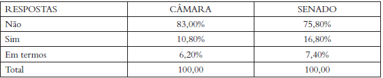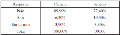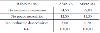 Avaliar a percepção sobre o papel dos partidos no regime democrático também éuma forma de medir valores políticos, pois a avaliação sobre os partidos é uma medidade reputação política. Os percentuais de respostas expostos na Tabela 4 certamente seexplicam pelo fato de que se trata de um público com informação privilegiada em relaçãoao Poder Legislativo, um segmento que compreende as funções dos partidos, apesar dasressalvas feitas. Outra observação é que a pergunta se refere especificamente à necessidadedos partidos e não à atuação das legendas nem à confiança dos respondentes.