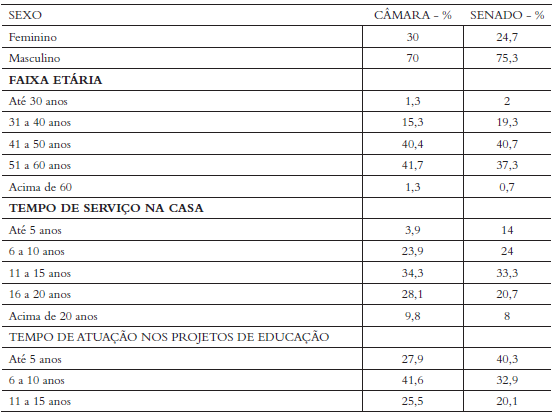 O grupo de respondentes é composto por 30% e 24,70% de mulheres, na Câmara e no Senado, respectivamente. O intervalo etário predominante nas duas casas varia de 41 a 60 anos, revelando um grupo maduro, o que justifica a elevada escolaridade, com 67,80% de servidores com pós-graduação stricto sensu na Câmara e 71,30% no Senado. A maioria apresenta de 6 a 15 anos de tempo de serviço nas duas instituições. A área administrativa apresenta um maior efetivo na Câmara (56,50%), enquanto no Senado o maior está na área legislativa (54,10%). O número de servidores filiados a partidos políticos é inexpressivo nas duas casas: 4% na Câmara e 5,40% no Senado. No grupo da Câmara, os partidos mais citados foram PV, com três menções; PT e PCO, com duas menções, e os seguintes com apenas uma menção: PR, PSOL e PSB. No Senado, o PV também recebeu três citações; o PT e PSOL, duas, e a Rede, uma.
