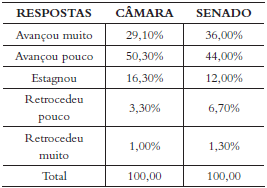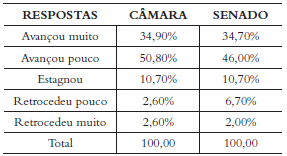 Indagados sobre a situação da democracia brasileira nas últimas décadas, as respostas dos dois grupos são relativamente similares entre os servidores da Câmara dos Deputados e do Senado Federal, em todos os tópicos, com predomínio da opinião de que houve pouco avanço (50,80% e 46,00%, respectivamente) e de que avançou muito (34,90% e 34,70%), como se lê na Tabela 1. Entre os argumentos apontados para justificar que avançou pouco, destacam-se constatações recorrentes de que “ainda há muito para a consolidação democrática no País, especialmente no que se refere à participação social e aos direitos civis e sociais”. Outro argumento citado com frequência pelos respondentes foi o que de “a nossa democracia ainda é incompleta por causa da grande desigualdade social que impede a plena cidadania, gerando um grande contingente de excluídos e de subcidadãos”. O terceiro argumento acionado pelos informantes diz respeito à “baixa qualidade dos serviços públicos oferecidos pelo Estado, o que prejudica especialmente os menos favorecidos”.