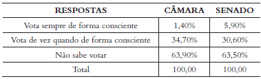Outra questão relevante do ponto de vista dos valores políticos é a percepção sobre o voto do conjunto dos cidadãos. Afinal, em um regime democrático, todo voto tem o mesmo peso, apagando, em tese, as hierarquias sociais e econômicas. Tal concepção de hierarquias sociais, contudo, pode permanecer na opinião dos informantes. Quanto a isso, predomina a concepção de que esses eleitores não sabem votar (63,90% e 63,50%, respectivamente), contra a percepção de 34,70% e 30,60%, entre os respondentes da Câmara dos Deputados e do Senado Federal, respectivamente, de que a maioria dos eleitores vota de vez em quando de forma consciente e apenas 1,40% e 5,90% que acham que o voto é sempre consciente (Tabela 3). Para os que responderam que a maioria dos eleitores não sabe votar, os argumentos são categóricos, resumidos nos seguintes relatos: