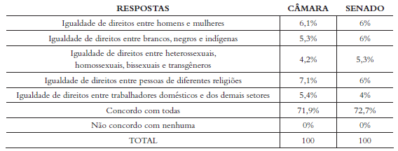 Acerca das políticas igualitárias, como exibido naTabela 5, prevalece um consenso dos respondentes a favor de tais políticas, com 70% em ambos os grupos, sem nenhum registro relativo à opção “Não concordo com nenhuma”.A dispersão de respostas distribuídas em alguns itens específicos parece indicar prioridades dos respondentes e não discordância em relação ao conjunto dos direitos, o que se deduz pelos dados já mencionados. Entre os argumentos apontados, destaca-se o seguinte:
