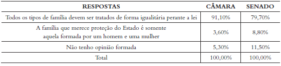 A mesma linha de raciocínio prevalece quando indagados especificamente sobre os direitos das famílias, uma das questões que têm mobilizado a opinião pública em função da proposta do Estatuto da Família5, que tem como objetivo definir o conceito de família. Como mostra a Tabela 6, 91,10% dos educadores da Câmara responderam que todos os tipos de família devem ser tratados de forma igualitária perante a lei, enquanto no Senado o percentual de repostas foi de 79,70%. Os argumentos acionados para sustentar essa perspectiva foram os seguintes: