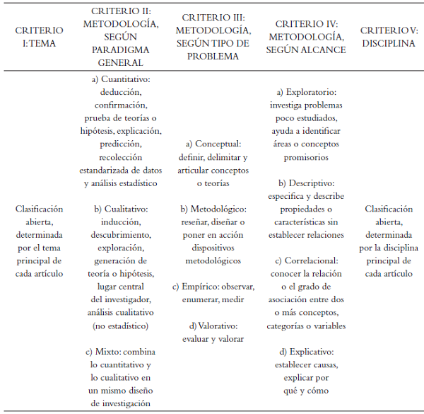 El segundo, una plantilla de análisis elaborada ad-hoc, constituida por cinco criteriosde interés e informaciones relativas a los componentes generales de los artículos – título,resumen, palabras clave, fecha de publicación – para la identificación y clasificación decada uno. Los cinco criterios de clasificación están inspirados en la propuesta de Moyano(1999), quien señala que la metodología designa tres procesos conexos: i) el estilo deafrontamiento o paradigma general que guía el abordaje de la realidad estudiada, ii) eltipo de problemas y, iii) el modo en que se responde a las preguntas de investigación. Así,los artículos fueron clasificados y analizados según los siguientes criterios: 1) el paradigmageneral que guía la investigación, con tres opciones posibles: a) cuantitativo, b) cualitativoo c) mixto (Johnson; Onwuegbuzie, 2004); 2) el tipo de problema analizado, con cuatroopciones: a) conceptual, b) metodológico, c) empírico o d) valorativo (Sierra Bravo,1987) y, 3) el alcance de las preguntas de investigación, también con cuatro opciones:a) exploratorio, b) descriptivo, c) correlacional o d) explicativo (Hernández; Fernández;Baptista, 2014). Siguiendo esta última clasificación, debe entenderse que el alcance vadesde un mínimo conocimiento previo acerca de la realidad – exploratorio –, pasandopor la descripción, ya sea narrativa o numérica, de la misma – descriptivo –, hasta llegar ala relación de asociación o covariación entre aspectos de la realidad – correlacional –, para,finalmente, alcanzar el nivel epistémico mayor de la explicación, que permite adquirir unsentido de comprensión de lo real. A estos criterios se les agregan uno temático y otrodisciplinar, ambos con clasificación abierta, para identificar temas y disciplinas propios decada uno de los artículos analizados. Los cinco criterios son resumidos a continuación(Tabla 1).
