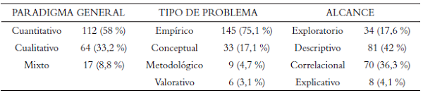 Respecto del alcance hay sólo un 4,7 % de estudios de tipo explicativo que nosólo exploran, describen o correlacionan, sino que se busca propiamente explicar ocomprender fenómenos complejos en el área. Casi un 20% son estudios exploratorios, esdecir, en los cuales se intenta abrir nuevos caminos de investigación en el ámbito.
