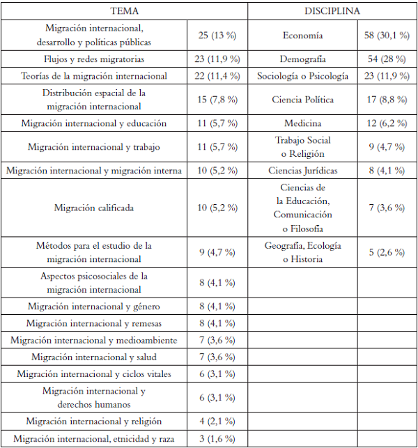 Por otra parte, acerca de los temas de investigación dentro del ámbito de la migracióninternacional y su relación con las disciplinas involucradas, se pueden distinguir para el conjunto de la muestra analizada 18 temas diferentes de investigación y nueve disciplinaso conjuntos de disciplinas que los tratan (Tabla 3).